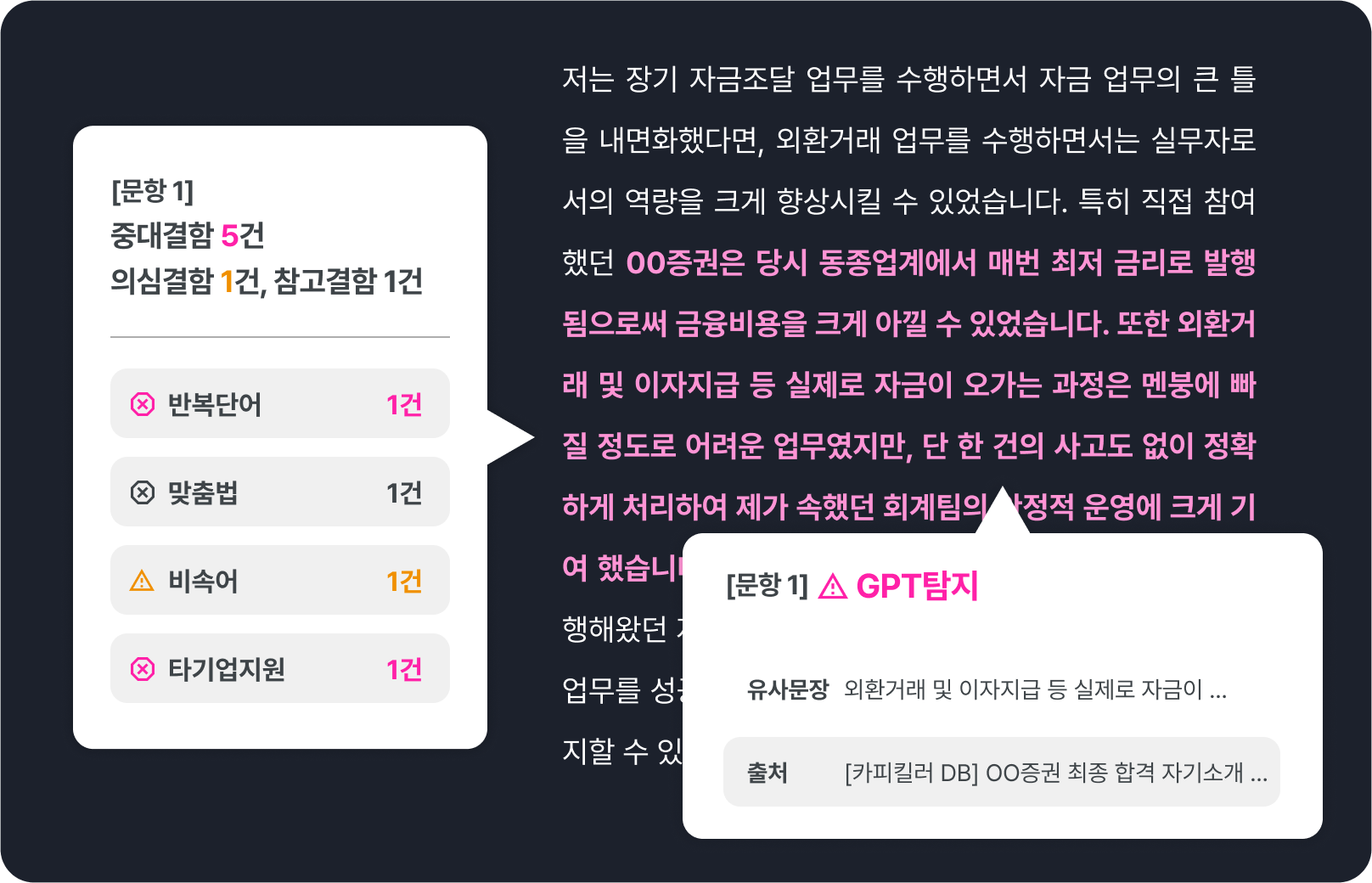 수많은 자기소개서를 동일한 기준으로 평가하고 적합성을 판단하는 일은 결코 쉽지 않습니다.프리즘x몬스터는 빠르고 정확하게 자기소개서를 검토하고, AI 작성여부까지 탐지해 경험의 사실 여부를 검증합니다.