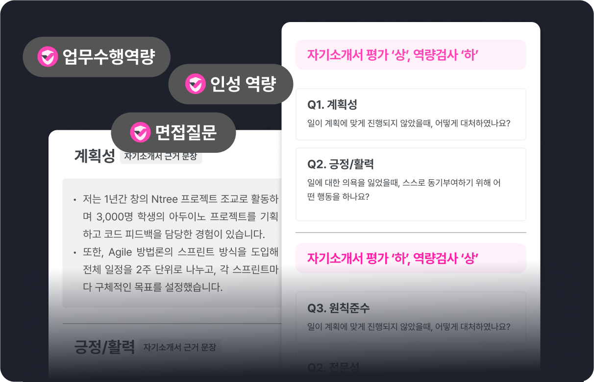 최적의 지원자를 확보하기 위해선전형별 평가 결과를 통합하고 일관된역량을 파악해야 합니다.프리즘x몬스터는 교차 검증 엔진으로자기소개서, 면접, 역량검사 결과를통합해 지원자의 진짜 역량을 찾아냅니다.